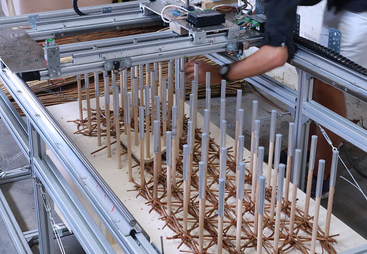 The "Recode Wicker" project investigated how the traditional and circular building materials willow and earth can be reinterpreted using digital production methods. Using spatial wicker structures with willow as a rapidly renewable raw material, the possibilities of the digital design and construction process were demonstrated. During the one-week workshop, components were produced on a scale of 1:1 on an individually designed machine.